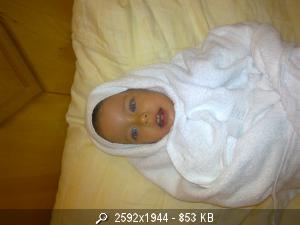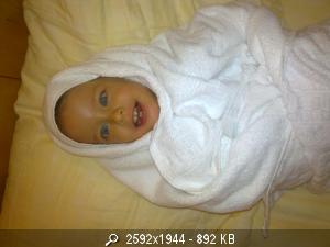 Может ползти на четвереньках, причем очень хорошо, но не хочет и все тут. Ей удобнее по пластунски. Вот и боремся я заставляю на четвереньках , а она со мной скандальничает и делает по своему. Умеет складывать пирамидку и башню кубиковую , правда неаккуратно. А, еще прикол – если Алька что то ест, а рядом мелькнет Ива (собака) она тут же всю еду отдает ей, даже изо рта все выгребет. Вот собака этим и пользуется – только учует у Альки в руках еду – сразу перед ней прыгать начинает и в глаза заглядывает. Если я сажусь кушать с ней на руках, то кормит меня хлебом. Умеет здороваться за руку (по-мужски) и ладошкой об ладошку взрослого ну и кулачком обкулачок. Умеет целоватся. Просиш – дай цем и , если у нее хорошее настроение, она подставляет ротик для поцелуя( правда почему то открытый ))) ) . Умеет одевать шапку. Очень любит плавать.